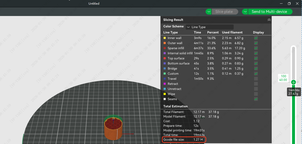 - Example: The interface shows that the G-code generated for the current build plate is 1.27 MB.