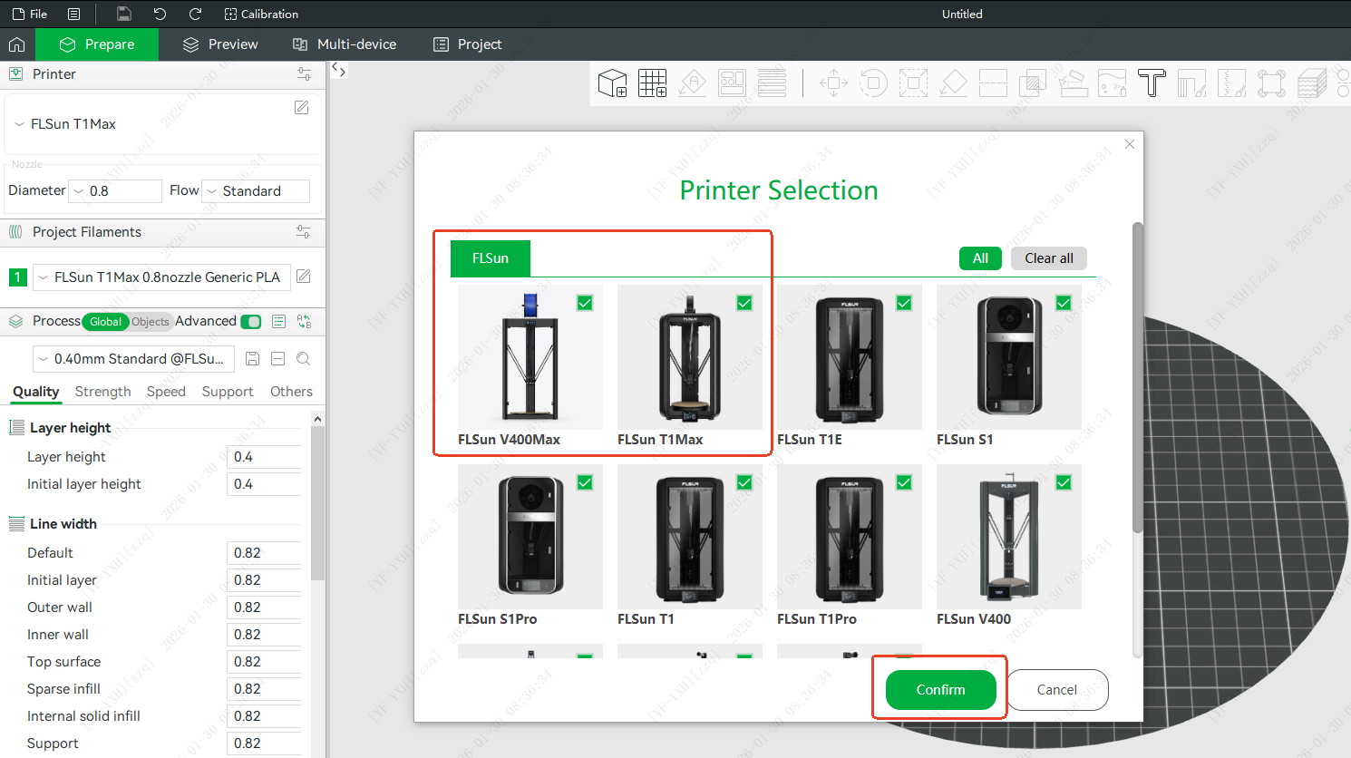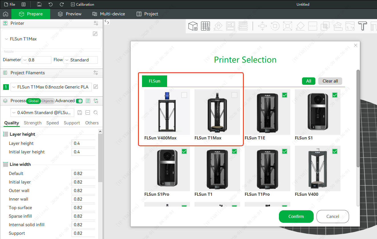 ⚠️ Note: If you are performing an overwrite installation, you must manually refresh the machine profiles. Go to the configuration menu, uncheck FLSun V400Max or T1Max, and then re-check them to apply the updates.