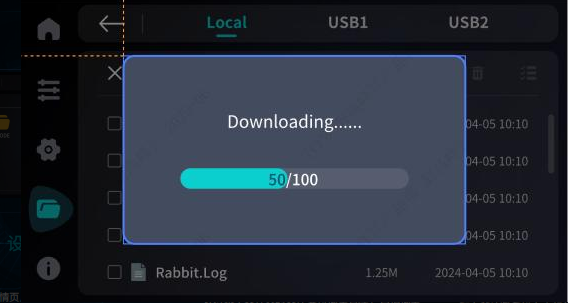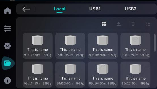 In the file details page, you can access files stored in Local Storage, USB1, and USB2, including G-code files and system logs.