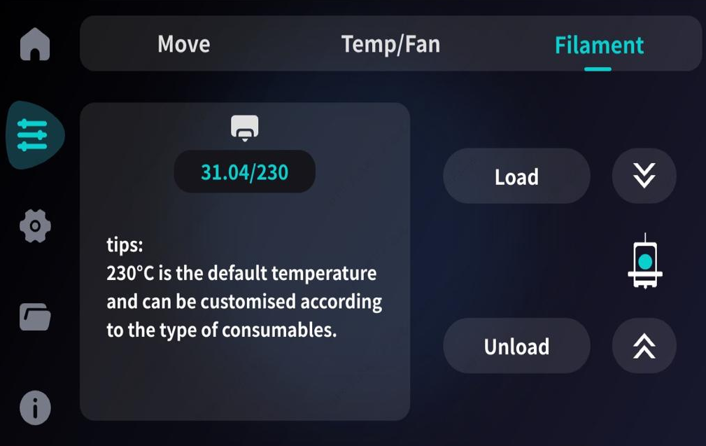 The default loading temperature is 230°C and can be adjusted manually. After clicking "Confirm," the device will begin heating and then proceed to load the filament.