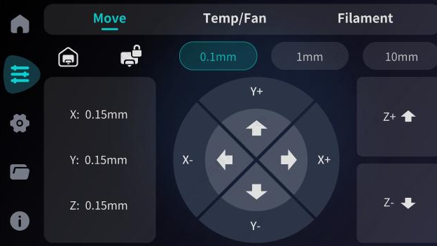 Axis movement includes Home All, Unlock Motors, and manual coordinate movement for the X, Y, and Z axes. Once the motors are unlocked, the effector can be moved manually. For X, Y, and Z axis movement, different step distances can be selected for precise quantitative positioning.