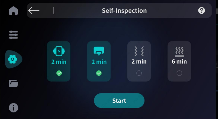 The device supports manually triggering a self-test before printing to ensure all components are functioning correctly. The self-test primarily includes: