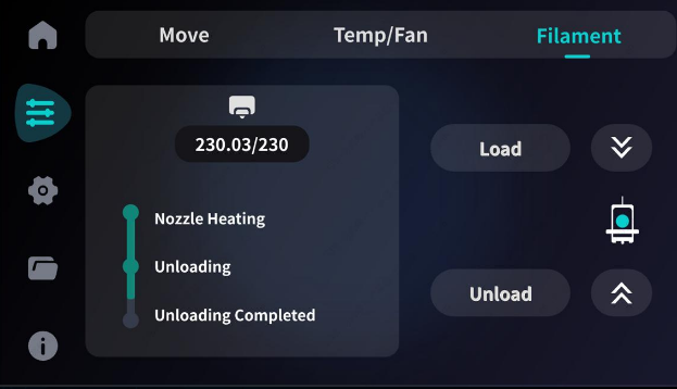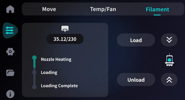 Filament loading and unloading can be controlled directly through the touch screen.